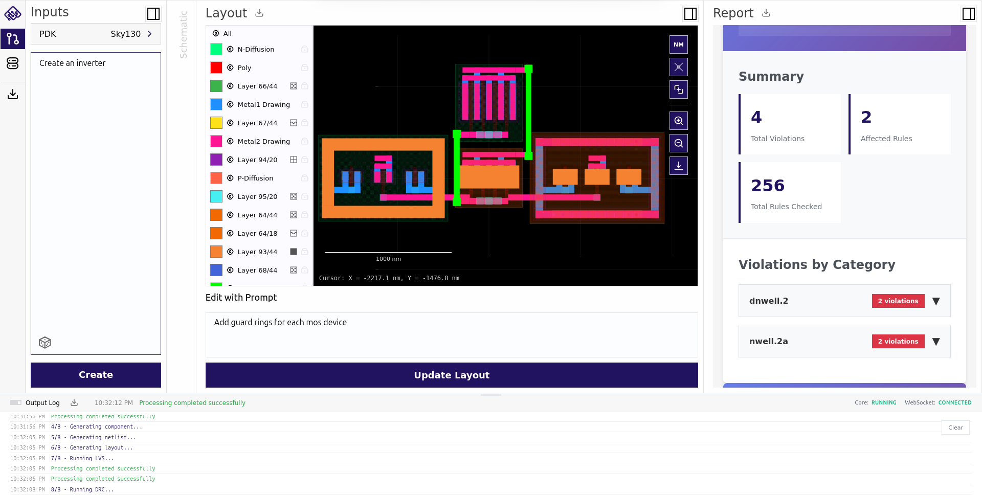 ANADETO Project EDA revolutionizes analog IC design with breakthrough AI automation that transforms your natural language descriptions into production-ready integrated circuits. Experience an intelligent, conversational design flow where you simply describe your circuit requirements alongside your Process Design Kit (PDK), and our advanced LLM engine instantly generates hierarchical schematic/netlist and comprehensive simulation testbenches using PDK symbols and device simulation information. Watch as the system creates and automatically validates your design through circuit simulations, ensuring optimal electrical performance. Need adjustments? Simply tell ANADETO Project EDA what you'd like to improve – whether it's frequency response, power consumption, transconductance characteristics, or any other parameter. Our AI intelligently interprets your feedback and iteratively refines your design through this conversational process until you're completely satisfied. Every interaction makes our system smarter, as the LLM database continuously learns from your feedback to deliver even better results for future designs. Once your circuit performs perfectly, ANADETO Project EDA seamlessly transitions to physical implementation, automatically generating hierarchical layouts with advanced placement and routing algorithms powered by PDK technology rules and layer definitions. Comprehensive Layout Versus Schematic (LVS) verification and Design Rule Check (DRC) validation ensure manufacturing-ready results. Maintain complete control over your layout with natural language feedback – optimize routing strategies, adjust device placement for matching, minimize parasitic effects, or modify metal layer utilization. This iterative optimization continues until your layout meets your exact specifications, with every refinement captured to enhance future designs.